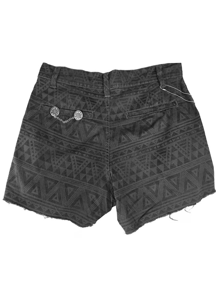 Black Grey Geometric Designs. Cutoff Shorts. Silver-Tone Buttons. Silver-Tone Chains. From Our Thrift Store in Franklin, Tennessee.